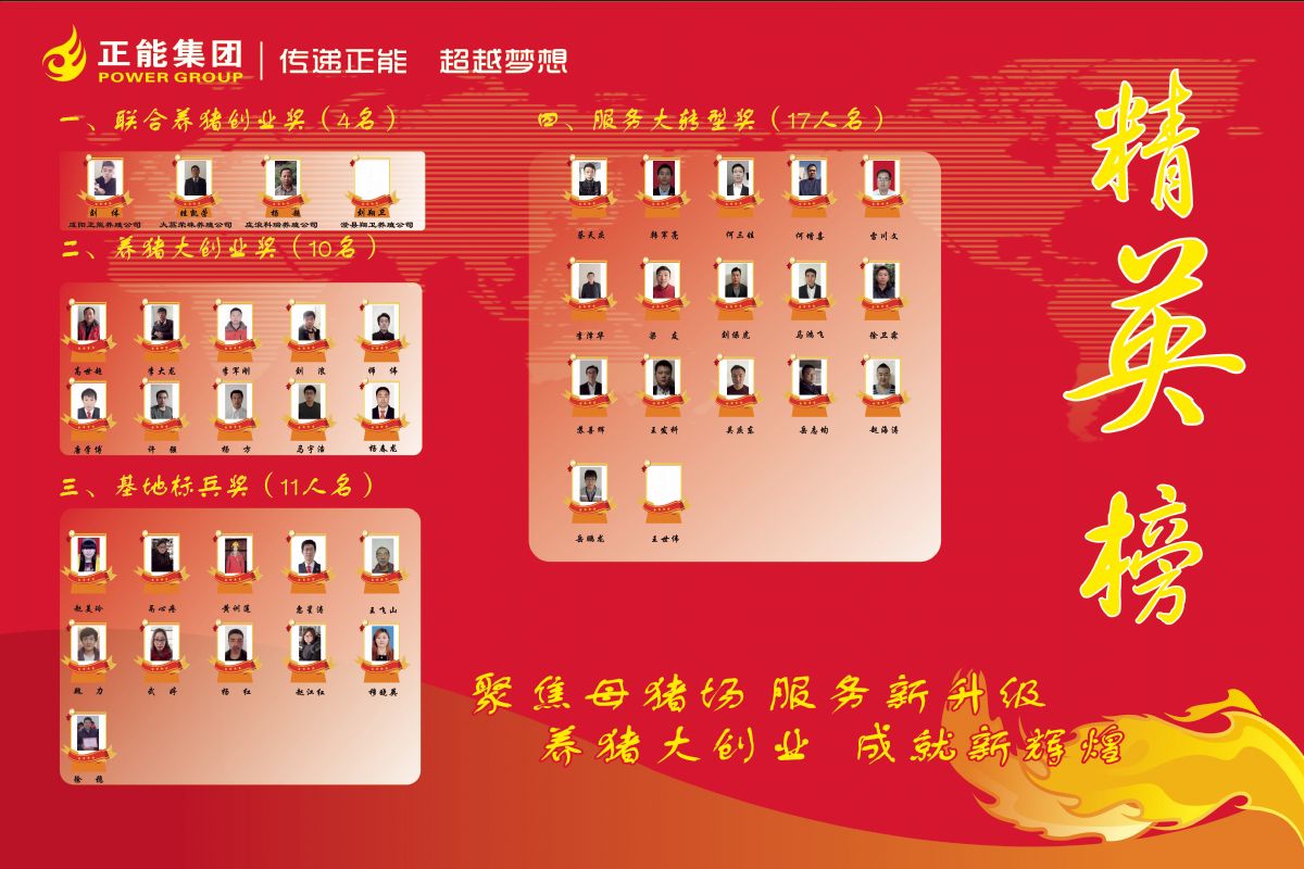 頒發(fā)了正能集團(tuán)2016年度“基地標(biāo)兵獎11人”、“養(yǎng)豬大創(chuàng)業(yè)獎10人”、“服務(wù)大轉(zhuǎn)型獎17人”、“聯(lián)合養(yǎng)豬創(chuàng)業(yè)獎4人”、創(chuàng)業(yè)英雄團(tuán)隊(duì)獎13個。個人獎項(xiàng)共計(jì)42個,每位獲獎英雄頒發(fā)了由正能集團(tuán)精心打造的100g純銀銀質(zhì)英雄獎?wù)乱幻。團(tuán)隊(duì)獎13個,頒發(fā)了創(chuàng)業(yè)英雄團(tuán)隊(duì)獎牌并給予2000元活動基金獎勵。