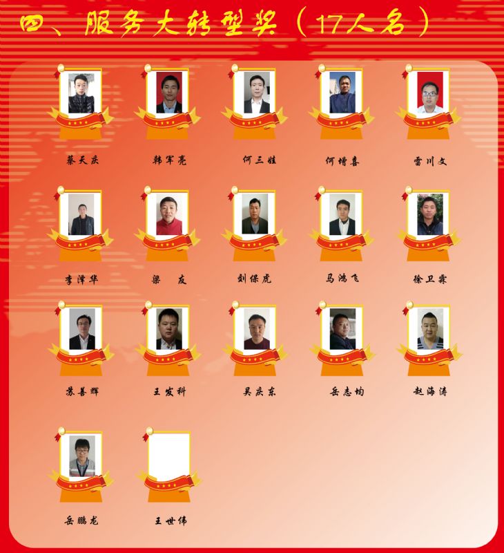 渭南事業(yè)部技術(shù)服務(wù) 馬宇浩 師偉 楊春龍 “基地標(biāo)兵獎“ 11名 甘肅事業(yè)部武威基地2人:穆曉英 王飛山 山西事業(yè)部新絳基地2人:武 婷 楊 紅 高陵基地6人: 趙江紅 鬲心疼 黃訓(xùn)蓮 魏力 徐穩(wěn) 惠星濤 山東營銷公司1人: 趙美玲 “服務(wù)大轉(zhuǎn)型獎”17名 西安事業(yè)部:徐衛(wèi)霖 王發(fā)科 甘肅事業(yè)部:岳志均 趙海濤 蔡天慶 咸陽事業(yè)部:梁友 何增喜 渭南事業(yè)部:蘇善輝 雷川文 韓軍亮 山西事業(yè)部:吳慶東 劉; 岳鵬龍 馬鴻飛 隴東事業(yè)部:李澤華 何三娃 隴南事業(yè)部:王世偉 “英雄團(tuán)隊(duì)獎”13支 青海養(yǎng)殖服務(wù)公司 渭東養(yǎng)殖服務(wù)公司 渭北養(yǎng)殖服務(wù)公司 榆林西養(yǎng)殖服務(wù)公司 涇三高養(yǎng)殖服務(wù)公司 禮乾養(yǎng)殖服務(wù)公司 安康東養(yǎng)殖服務(wù)公司 西安大客戶養(yǎng)殖服務(wù)公司 靜寧養(yǎng)殖服務(wù)公司 高陵基地生產(chǎn)部 武威養(yǎng)殖服務(wù)公司 稷山養(yǎng)殖服務(wù)公司 臨汾養(yǎng)殖服務(wù)公司