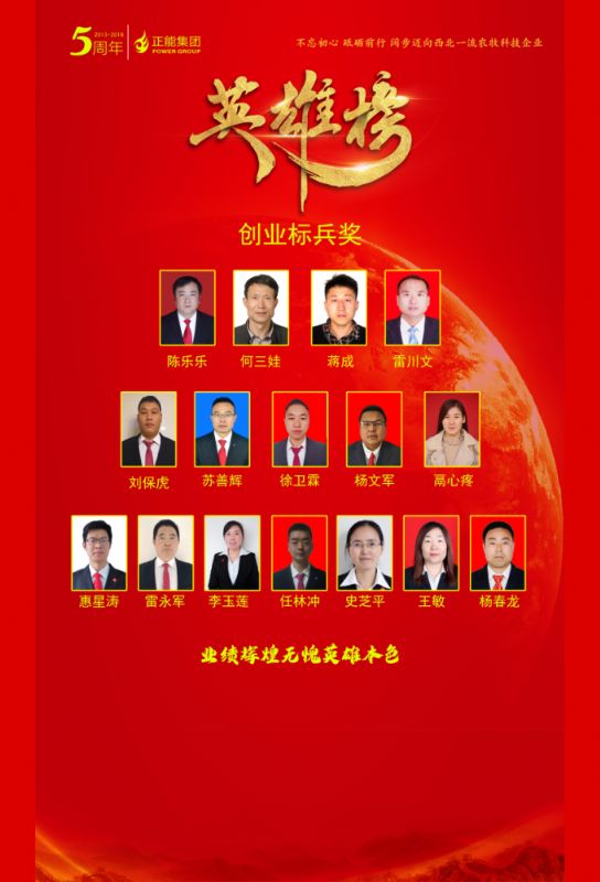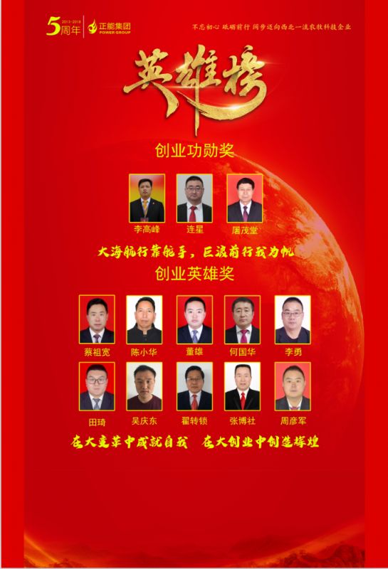聯(lián)合發(fā)展獎(jiǎng)-優(yōu)秀供應(yīng)商 獎(jiǎng)牌木托+水晶獎(jiǎng)杯 西安邦淇制油科技有限公司 益海嘉里興平食品工業(yè)有限公司 三原三森膨化飼料有限公司 陜西寧興泰商貿(mào)有限公司 西安裕豐牧業(yè)有限責(zé)任公司 創(chuàng)業(yè)標(biāo)兵獎(jiǎng) 16 銀牌 8 咸興武養(yǎng)殖服務(wù)公司 陳樂樂 漢中養(yǎng)殖服務(wù)公司 徐衛(wèi)霖 渭北養(yǎng)殖服務(wù)公司 雷川文 濟(jì)源養(yǎng)殖服務(wù)公司 楊文軍 稷山養(yǎng)殖服務(wù)公司 劉; 隴東事業(yè)部 何三娃 山東事業(yè)部 蔣 成 秦東事業(yè)部 蘇善輝 創(chuàng)業(yè)標(biāo)兵獎(jiǎng) 8 養(yǎng)豬事業(yè)部 合同豬放養(yǎng)部技術(shù)經(jīng)理 楊春龍 養(yǎng)豬事業(yè)部 九龍?jiān)簇i場(chǎng)廠長 任林沖 高陵基地品管部經(jīng)理 惠星濤 高陵基地生產(chǎn)部經(jīng)理 雷永軍 高陵基地采購部經(jīng)理 史芝平 高陵基地財(cái)務(wù)部經(jīng)理 王 敏 新絳生產(chǎn)基地 銷管 李玉蓮 高陵基地 銷售主管 鬲心疼 創(chuàng)業(yè)標(biāo)兵獎(jiǎng)(金牌) 養(yǎng)豬事業(yè)部 供銷部總監(jiān) 韓軍亮老師 武威生產(chǎn)基地 銷 管 穆曉英老師 創(chuàng)業(yè)英雄獎(jiǎng)(10人) 銀牌 榮獲正能集團(tuán)五周年 “創(chuàng)業(yè)英雄獎(jiǎng)”的創(chuàng)業(yè)英雄干部共10人 隴東事業(yè)部 總經(jīng)理 李 勇 陜南事業(yè)部 總經(jīng)理 董 雄 河西事業(yè)部 總經(jīng)理 蔡祖寬 河?xùn)|事業(yè)部 總經(jīng)理 陳小華 秦西事業(yè)部大客戶部 總經(jīng)理 張博社 秦西事業(yè)部禮乾養(yǎng)殖服務(wù)公司 總經(jīng)理 翟轉(zhuǎn)鎖 新豐泰事業(yè)部新甘隴 總經(jīng)理 田 琦 晉北事業(yè)部晉中養(yǎng)殖服務(wù)公司 總經(jīng)理 吳慶東 晉南事業(yè)部運(yùn)城養(yǎng)殖服務(wù)公司 總經(jīng)理 周彥軍 陜北事業(yè)部大客戶部 總經(jīng)理 何國華 創(chuàng)業(yè)功勛獎(jiǎng) (3人) 銀牌 集團(tuán)副總裁、秦西事業(yè)部總經(jīng)理 屠茂堂老師 養(yǎng)豬產(chǎn)業(yè)總裁 李高峰老師 集團(tuán)副總裁、產(chǎn)品技術(shù)研發(fā)總監(jiān) 連星老師